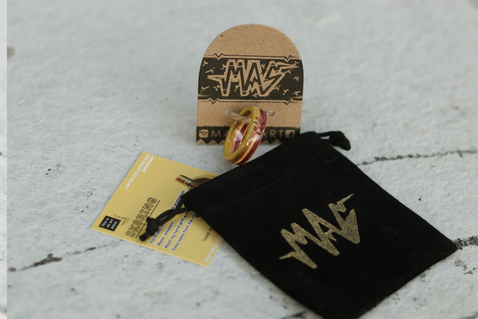 Slide into style with our Wooden SK8 Rings, crafted from upcycled skateboards and polished to a dazzling shine. Each ring features our engraved logo and comes in eco-friendly packaging. At just 0.7mm (1/4") thick , these limited-edition treasures are as unique as your kickflips. Don't forget to measure your finger first!